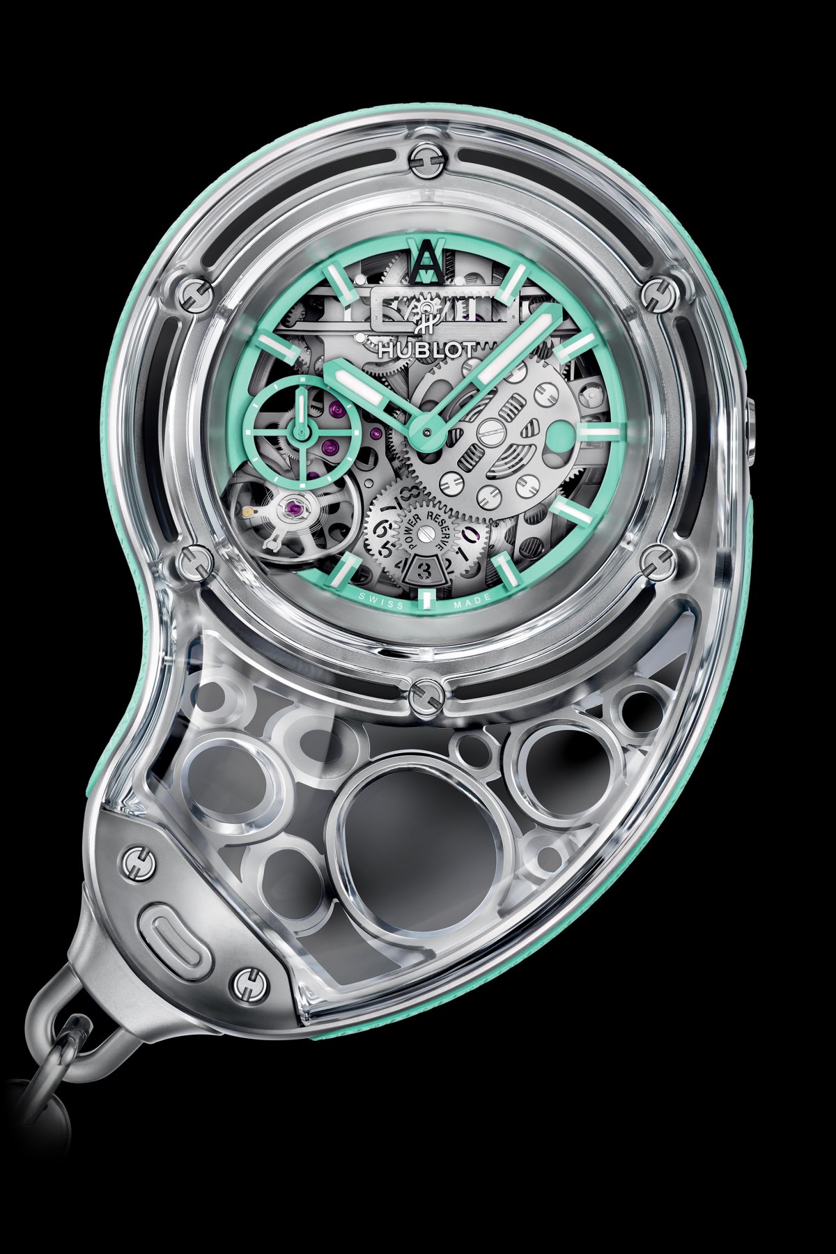 El diseño orgánico se complementa con una caja de titanio y protectores de caucho, lo que refleja una audaz ruptura con los cánones de la relojería tradicional. Presentado con dos cadenas de titanio, cada una con el sistema doble «one-click» de Hublot, el reloj puede usarse de múltiples maneras, desde un collar hasta un reloj de bolsillo, o exhibirse como una pieza central escultural en su soporte de mesa decorativo de titanio y cristal mineral.