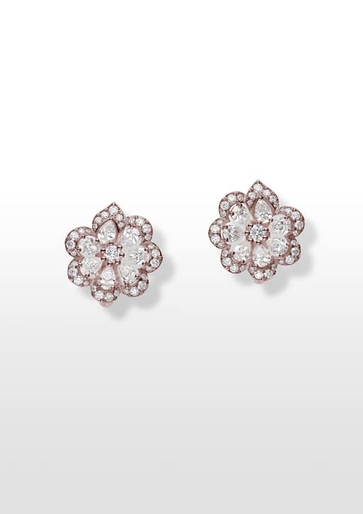 Estos pendientes son muestra del diseño llamado Mini-Froufrou que hace referencia a los bordes festoneados y sus pétalos de diamante talla pera sobre un fondo calado, también forma parte de la inspiración un anillo, colgante y un brazalete junco.