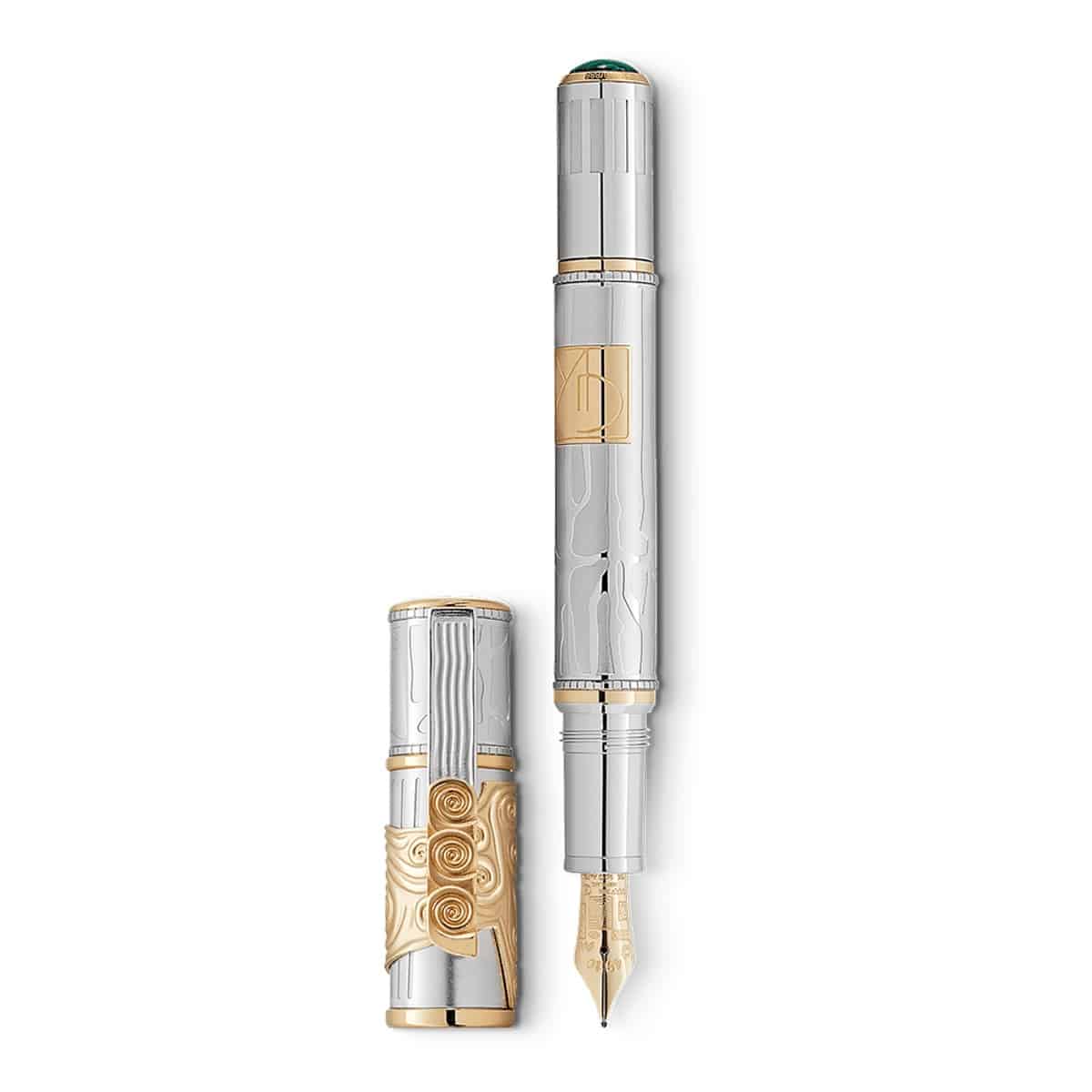 La combinación de oro amarillo 750 y elementos con acabado platinado en el capuchón y el depósito de esta pluma fuente evocan los materiales experimentales y lujosos típicos de Gustav Klimt. La interacción se enriquece con un cabujón de malaquita en la contera.