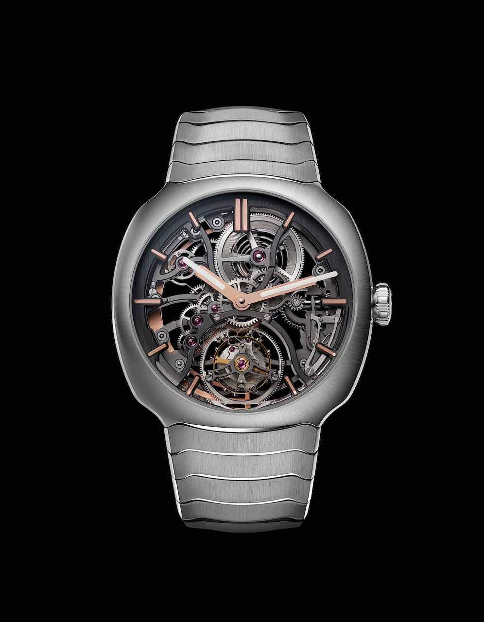 Streamliner Tourbillon H MoserEn el corazón de este reloj excepcional, totalmente esqueletizado, late un tourbillon volante de un minuto con espiral doble, que parece flotar ingrávido. Es una audaz declaración de estilo y un alarde de ingeniería. La pieza, de elegancia refinada y una estética espectacular, se presenta en una caja Streamliner de 40 mm de diámetro. Este reloj deslumbra con índices facetados y agujas bañadas en oro 5N, que incorporan un toque lumínico de Globolight.